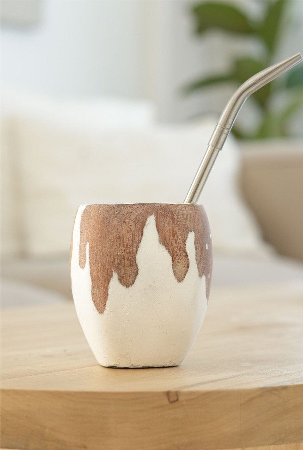 Cada mate es una pieza única, hecha a mano por uno de los mejores artesanos del país. Elaborado en madera de algarrobo, destaca por su nobleza y durabilidad.